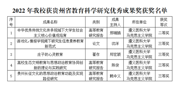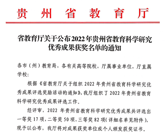 近日,贵州省教育厅发布了《关于公布2022年贵州省教育科学研究优秀成果奖名单的通知》,公司共有5项成果获奖,均为yl7703永利集团教师获得。其中,二等奖1项,三等奖4项,获奖数量位居全省高校第四名,蝉联我省医学类高校第一名。
