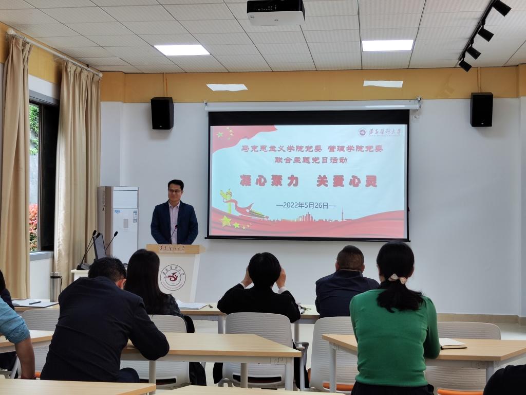 为进一步落实党内关怀制度,切实提高教职工身心健康水平,强化党员心理健康防护意识,增强党组织的凝聚力,5月26日,公司党委、管理公司党委在人文楼党员之家联合开展“凝心聚力 关爱心灵”主题党日活动。活动由公司党委第一党支书记李娇娇主持,公司党委委员、管理公司党委委员、公司党委第一党支部、管理公司党委教工党支部全体党员及入党积极分子参加活动。