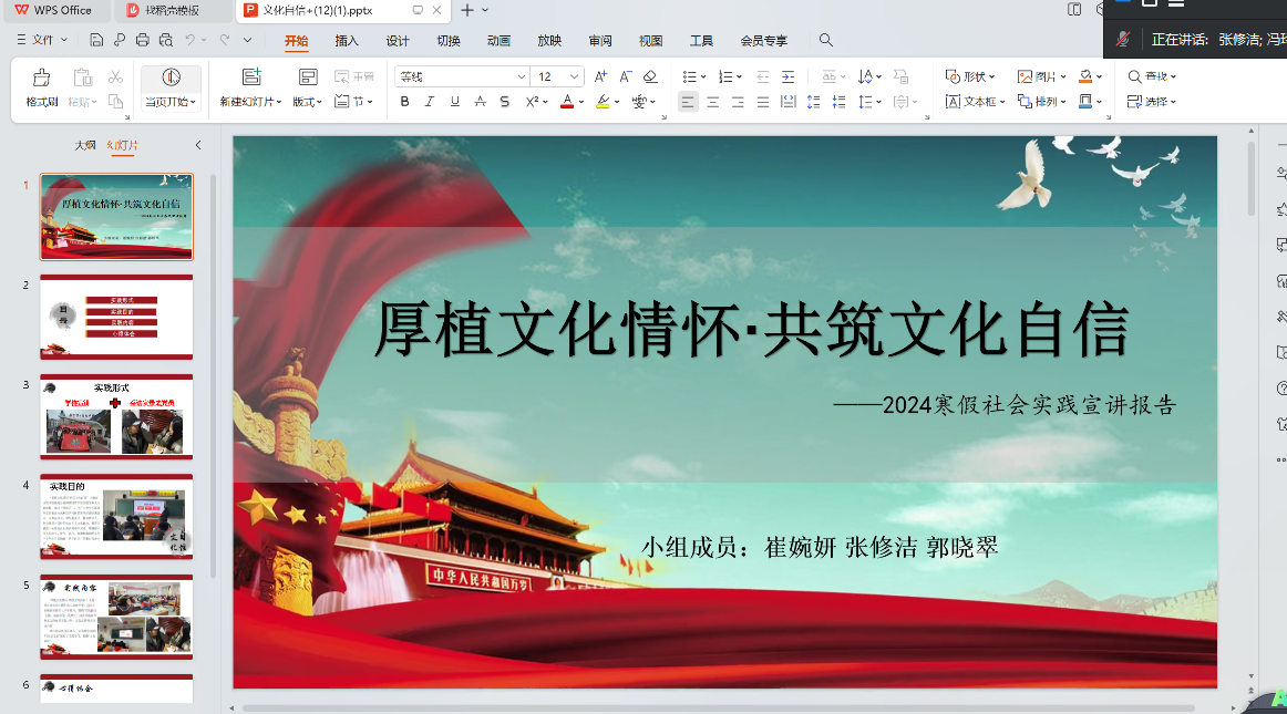 活动围绕年俗分享和寒假社会实践情况汇报展开。首先,支部书记领学了习近平文化思想的部分内容。随后,支部党员杨昱璇、周珏、陈雪三位同学分别分享了自己家乡的年俗文化。通过介绍不同地区、不同民族独特的新年习俗,支部成员进一步感受到我国传统文化的独特魅力和深厚底蕴。最后,支部成员冯玲、余志涛、张修洁、王雯伽、余孜欣依次分享寒假社会实践宣讲的情况。此次寒假社会实践以宣讲习近平文化思想为主题,旨在推动党的创新理论飞入寻常百姓家。各位宣讲人员详细介绍了自己的宣讲过程、取得的效果和存在的不足,表示将进一步增强理论学习的自觉性,自觉学习宣传和实践党的创新理论。